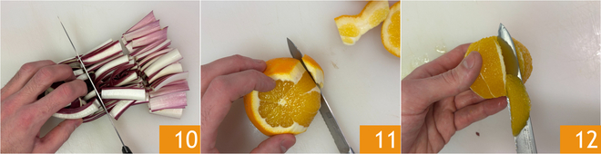 In the meantime, prepare the side dish: wash and dry the radicchio, remove the base, and cut it into pieces about 1 inch long 10. Peel the oranges live by removing both the peel and the white part 11, then extract the segments by inserting the knife blade between the pulp and the membrane 12.