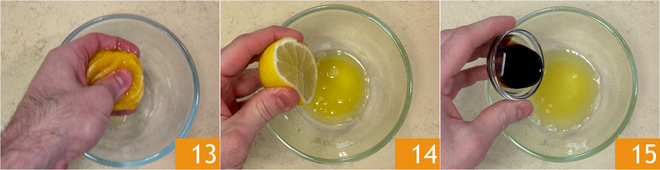 Set the orange segments aside and squeeze the orange scraps into a bowl to get about 50 g (about 1/4 cup) of juice 13. Add the lemon juice 14 and the balsamic vinegar 15.