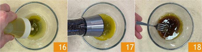 Add the oil 16, salt, and pepper 17. Mix vigorously with a fork to create an emulsion 18.