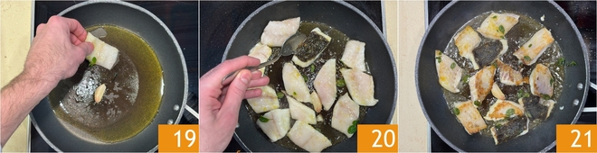 In a large pan, heat a drizzle of oil with a clove of garlic in its skin, then place the turbot pieces skin-side down 19. Cook on high heat for a maximum of 5 minutes until the skin becomes crispy, then turn them over 20, turn off the heat, and leave them in the pan for another couple of minutes 21.