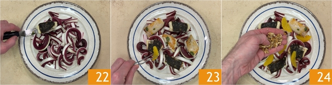 You are ready to plate: arrange the radicchio at the base of the plate, then add the turbot 22 and the peeled orange segments 23. Sprinkle with walnut crumbs 34.