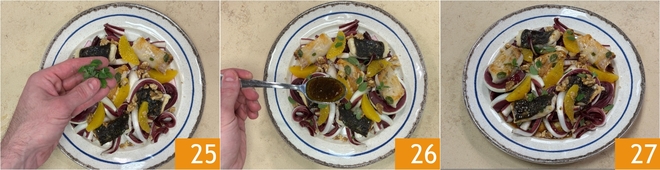 Garnish with a few marjoram leaves 25 and dress with the citrus emulsion 26. The pan-fried turbot with orange, radicchio, and walnut salad is ready to be served 27!