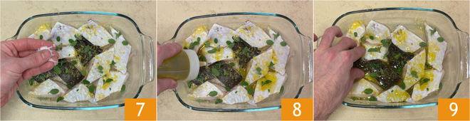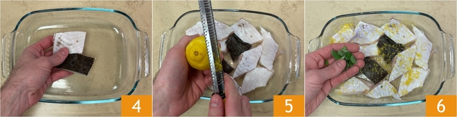 Transfer the fish pieces to a baking dish 4 and flavor with lemon zest 5 and marjoram leaves 6.