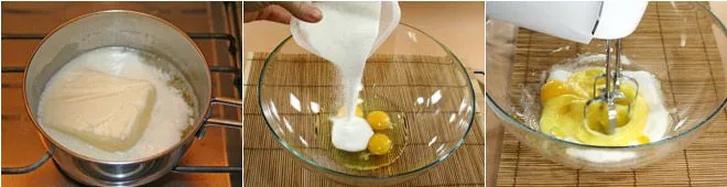 Crack the eggs into a large bowl, where you'll add the sugar and seeds from the vanilla bean; beat the ingredients with an electric mixer or whisk until you obtain a creamy mixture, then add the melted, now cool butter, a pinch of salt, and mix.