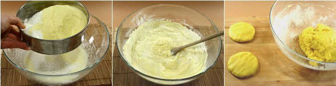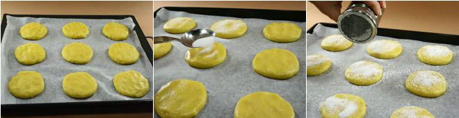 Mix the cornmeal with all-purpose flour and the packet of baking powder, then sift everything into the bowl containing the liquid ingredients. Mix and combine all the ingredients well until you get a soft but workable dough. Take about 2-2.5 oz of dough at a time and form a ball that you will flatten into a circle 3 inches in diameter; proceed this way until you finish the dough, and place the obtained shapes on a baking sheet lined with parchment paper and, if you find them available, sprinkle the sweets with elderflowers.