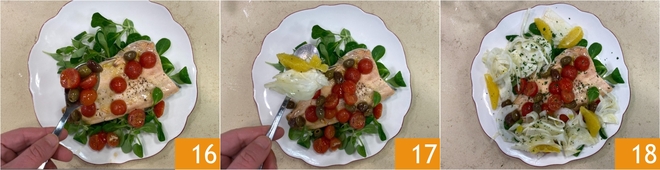 Place a trout fillet on top with its cherry tomato and olive sauce 16, then add the fennel and orange salad to the side 17. Finally, garnish with chopped parsley. Your pan-seared salmon trout is ready to be served 18!