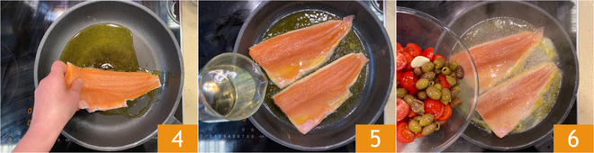 Heat a drizzle of oil in a large non-stick pan and lay the trout fillets skin-side down 4. Cook over medium heat for 2-3 minutes, then slightly increase the heat and deglaze with white wine 5. Once the alcohol has completely evaporated, add the cherry tomatoes and olives mix 6.