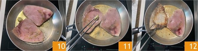 Do not touch the swordfish for about 4 minutes over medium-high heat 10, this way it will form a golden crust. Remove the garlic from the pan 11. After 4 minutes, flip the swordfish slices 12.