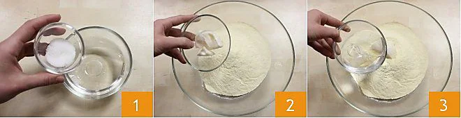 Start by preparing the panada dough: dissolve the salt in lukewarm water 1, add the lard 2 (or the same amount of extra virgin olive oil) to the semolina flour, start kneading by adding the lukewarm water little by little 3.