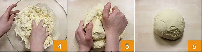 Knead vigorously by hand 4 until you gather all the ingredients (or use a stand mixer with a hook), then transfer the dough to a work surface and knead it vigorously, pulling the dough with your hands 5 until there are no more "wrinkles"; you should get a fairly firm and smooth dough, it will take about 15 minutes. In the end, it should be well compact but not too dry otherwise you won’t be able to roll it out and work it 6.