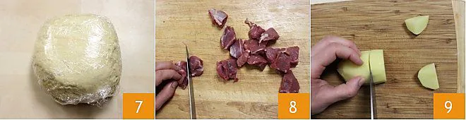 Cover it well with plastic wrap 7 and let it rest for about half an hour in a cool place (but not in the refrigerator). Meanwhile, cut the lamb into small pieces 8, peel the potatoes and cut them into chunks 9 not too small.