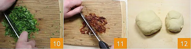 Chop the garlic, parsley 10, and sun-dried tomatoes 11. Take the dough ball and divide it into two parts 12, the proportions should be about 1/3 for the cover (the lid) and 2/3 for the base that will contain the filling.