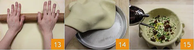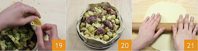 Create folds by overlapping the excess dough edges along the entire circumference (19-20). Cover with a damp cloth, so the dough doesn't dry out, and set aside. Meanwhile, roll out the smaller dough ball into a round sheet 21 with a diameter of 8 inches and about 0.2 inches thick (which will be the lid for the panada).