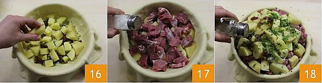 cover with half of the potatoes 16 and half of the lamb pieces, salt and pepper, add another part of parsley, sun-dried tomatoes, garlic, salt, and pepper 17. Then make another layer with the remaining potatoes and lamb, finish with the parsley, sun-dried tomatoes, and garlic, salt, pepper 18, and if you prefer, drizzle with some more oil.
