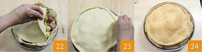 Place the round sheet in the center of the panada 22 and carefully seal the edges with your fingers, pinching the dough. Once you have closed the dough well, you can decorate it with the typical cord formed by pinching the dough between your thumb and index finger 23. Continue this way around the entire circumference. Bake in a preheated static oven at 392°F for 30 minutes and then at 356°F for about 1 hour. The panada will be ready 34 when you shake it and hear the juice released from the meat moving inside. Remove it from the oven, let it cool slightly, and take it out of the pan. Cut the top part and serve the panada hot!