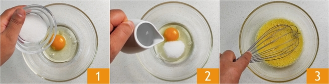 To make pancakes without milk, add the egg and sugar to a bowl 1, then add room temperature water 2 and stir with a hand whisk to mix the ingredients well 3.