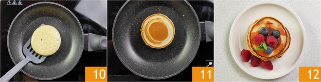 At this point, flip the pancake to the other side 10 and cook for another minute 11. As they cook, stack the pancakes on a plate and continue this way until you finish all the batter; with these amounts, you will get 12 pancakes with a diameter of about 3 inches. Serve your pancakes without milk while still hot, accompanied by fruit and sauces to taste 12!