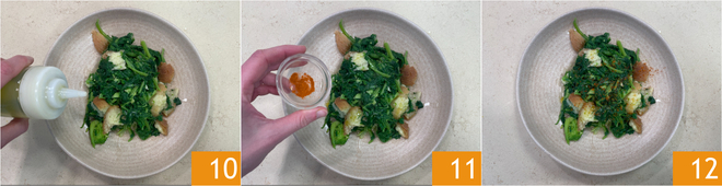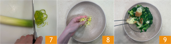 Meanwhile, clean and finely chop the leek 7, then distribute it on the bottom of the plates 8. Drain the vegetables and bread and transfer them to the plates 9.