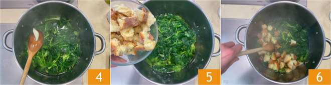 Once cooked, remove the garlic 4 and add the broken pieces of bread 5. Stir 6 and continue cooking for another 5 minutes, just enough time to soften the bread.
