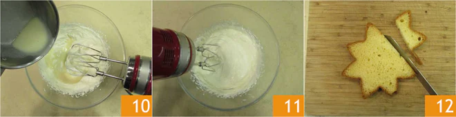 Pour the cream and gelatin mixture over the yogurt cream 10 and work for another 2 minutes with the electric mixer 11. Set aside the cream. Cut 0.5-inch thick slices of pandoro, remove the crust 12