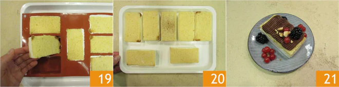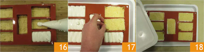 and cut out 14 rectangles of 2x3.5 inches 13. Place 7 pandoro rectangles in a silicone mold with 7 portions 14 and press them lightly with your fingers. Transfer the yogurt cream into a piping bag without a tip 15.
