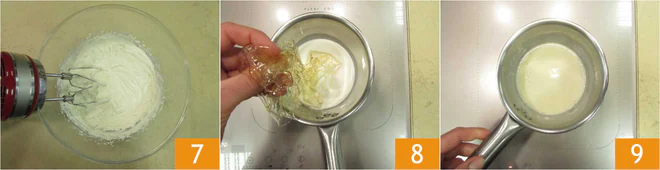 Set aside the whipped mixture 7. In a saucepan, pour the remaining 0.7 oz of fresh cream and add the previously soaked gelatin with part of the soaking water 8 for a total weight of 0.9 oz. Heat the ingredients until the gelatin is completely dissolved 9.