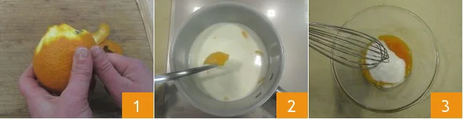 To prepare pandoro trees with custard cream and currants, start with the cream, which you can flavor with orange and cinnamon: take the orange, wash it, and dry it, then peel it, trying to take only the outer zest and not the more bitter white part 1. Pour the milk into a small saucepan and turn on low heat, then add the cinnamon stick and orange zest 2 and bring it to a simmer. At this point, turn off the heat, cover the saucepan with plastic wrap, and let it cool down: this way, the aromas will not disperse. Meanwhile, in a large bowl, pour the egg yolks (with the leftover egg whites, you can make crunchy meringues or cat tongues!) and whisk them together with the granulated sugar with a hand whisk 3.