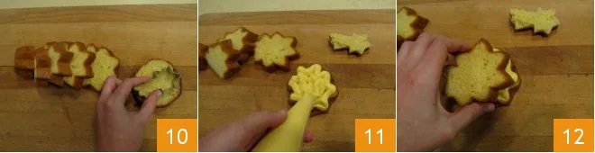 Cut out the base with a star-shaped biscuit cutter 10. Then fill the next slice with custard cream, using the piping bag and filling the entire surface well 11: this will be the base of your pandoro tree. Then place the next slice on top 12 and continue alternating layers of custard cream with pandoro until you create the shape of a small fir tree.