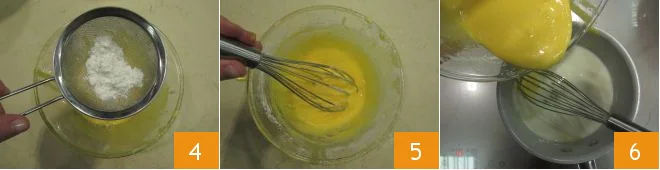 When you have obtained a smooth and fluid mixture, gradually add the cornstarch, sifting it directly into the bowl 4, and mix again to absorb it. Now remove the plastic wrap from the saucepan with the milk, discard the orange zest and cinnamon stick, and temper the egg yolk, sugar, and cornstarch mixture with a little milk. Mix 5 and transfer the entire mixture to the saucepan with the milk 6. Turn on the heat to low and continue stirring with the whisk until the cream thickens: it will only take a few minutes.