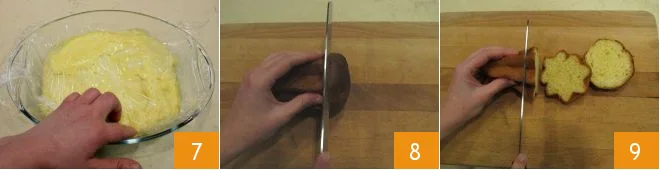 Then pour the cream into a wide and shallow dish and let it cool at room temperature, then cover with contact plastic wrap and put in the refrigerator to chill 7. When the cream is cold, you can transfer it to a piping bag. Meanwhile, cut the pandorinos into slices, starting from the bottom (8-9) until you reach the top.
