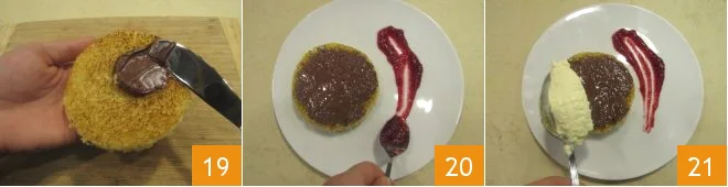 Once cooled, spread each pandoro disc with 0.5 oz of Nutella® 19, place them on a serving plate, and brush the plate with the red fruit sauce 20. Add a quenelle of ricotta mousse on top of the pandoro wafer 21