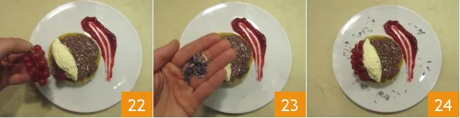 and garnish with a raspberry and a sprig of redcurrants 22. Finally, decorate the plate with edible flowers 23: your pandoro wafer with ricotta mousse and Nutella® is ready to be served 34!