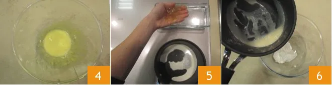 and continue beating the mixture until it cools 4: this way you will have obtained a pate à bombe. Now heat about 0.7 oz of cream, squeeze the gelatin sheets and dissolve them in the hot cream 5, stirring carefully. Sift the ricotta into a bowl, pour the cream and gelatin mixture into the bowl 6 and work everything with a whisk or spatula.