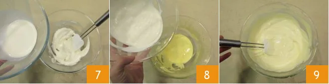 Add the remaining cream (about 2.8 oz) 7 and mix again to combine everything. Now add the obtained mixture to the pate à bombe 8, gently folding with a spatula from bottom to top to incorporate it 9. Cover the bowl with plastic wrap and chill the ricotta mousse in the refrigerator for at least 2 hours.