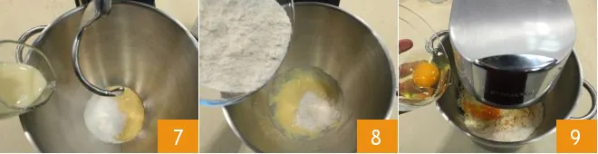 then the condensed milk 7 and the sifted flour 8; then turn on the stand mixer with the paddle attachment and add the eggs, one at a time, waiting for the previous one to be absorbed before proceeding with the next 9.