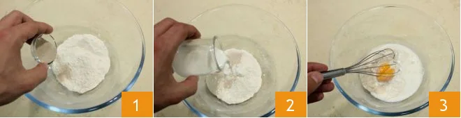 To prepare the pandoro with condensed milk and chocolate chips, start with the starter dough: in a bowl, pour the sifted flour, the dry yeast 1 (if you use fresh yeast, you can use 15g, dissolving it in warm milk); then add the warm milk 2 and an egg yolk, then mix with the whisk 3
