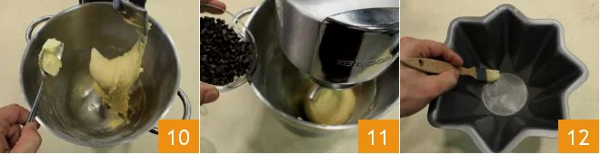 When the dough is homogeneous and detaches from the sides, replace the paddle with the hook, let the mixer run for a few minutes, then add the softened butter one piece at a time, waiting for the previous piece to be absorbed before proceeding with the next 10. When all the butter is incorporated, add the chocolate chips 11. Take a pandoro mold with a capacity of 1.65 lbs and grease it thoroughly 12.