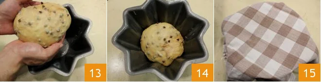 Turn the dough onto a slightly greased work surface, work it to form a ball, and place it in the pandoro mold (13-14); cover with a clean cloth 15 and let rise until it reaches the edge of the mold (this will take about 6 hours).