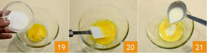 In a small bowl, pour the egg yolks, add the sugar 19, and mix to turn it into a cream 20, then add the heated cream with condensed milk 21