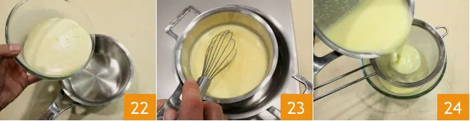 then return the mixture to the saucepan where you heated the cream and condensed milk 22 and place the saucepan in a bain-marie, making sure that the water in the larger pot does not touch the bottom of the small saucepan where you placed the custard; stir with a whisk 23 and bring the custard to 181°F, measuring the exact temperature with a kitchen thermometer. Then turn off the heat and pass the custard through a sieve to remove lumps and vanilla bean residues 34.