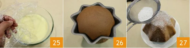 Cover with plastic wrap in contact with the custard 25 and let it cool at room temperature, then place in the refrigerator until ready to use. When the pandoro has risen, place it in the oven for baking: place a bowl filled with water in the oven on the lowest part, then bake the pandoro in a preheated static oven at 338°F for 55 minutes. Before removing from the oven, check the cooking with a toothpick. Once baked, remove it from the oven 26, then flip it onto a serving plate to cool completely. Once cold, sprinkle with powdered sugar as desired 27: the pandoro with condensed milk and chocolate chips is ready to be served!
