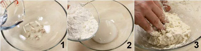 Start the preparation of the olive bread by making the pre-fermented dough. Place the crumbled yeast, lukewarm water 1, flour, and salt 2 in a small bowl: knead for a few seconds 3 and then cover the bowl with plastic wrap and let it rise for about 1.5 hours at room temperature.