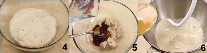 The pre-fermented dough should double in volume 4. Meanwhile, crumble the brewer's yeast in a small bowl and dissolve it with a little lukewarm water (taken from the recipe's dose) along with the malt (or honey) 5; put the flour in the mixer bowl fitted with a paddle attachment, start it at speed 1, and add the yeast mixture 6