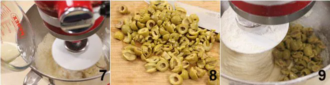 the remaining water, in which you have dissolved the salt and oil 7. Knead for about 10 minutes, add the pre-fermented dough, and when the mixture becomes homogeneous, remove the paddle, replace it with the dough hook, and continue kneading (another 10 minutes) until the dough wraps around it (you may need to add a little flour on the sides of the bowl). During the process, at least a couple of times, stop the machine and use a spatula to clean the sides of the bowl and flip the dough. One minute before finishing kneading, add the roughly chopped olives (8-9) and pat them with absorbent paper.