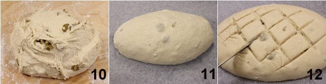 Place the dough on a lightly floured work surface 10, work it for a few seconds to give it a spherical shape 11, then flatten it slightly, roll it up on itself to give it a long shape (like a loaf), and then let it rise in the turned-off oven with the light on, on a baking tray lined with parchment paper until it doubles in volume. Before baking the olive bread in the preheated oven at 356°F for at least 40 minutes, make diamond-shaped cuts (not too deep) on the surface with a smooth, very thin, and sharp knife 12. When the surface of the olive bread is nicely golden, take it out of the oven and let it cool on a rack.