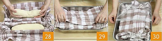 Place the loaves each on a cloth 28, sprinkle them with plenty of semolina, and close the edges of the cloths to cover the bread 29. Cover the tray with plastic wrap (not too tight, otherwise there will be no space for the rise) or place it in a large food bag 30. The 'pane cafone' should rise for 8-10 hours.