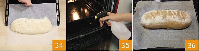 Slide the parchment paper onto the very hot baking sheet 34 and before putting the bread in the oven, spray some cold water in the oven for 3-4 times using a spray bottle 35. Alternatively, you can place a pan containing 3-4 ice cubes at the bottom of the oven. Put the bread in the oven and spray more water 3-4 times. Place the bread 1/3 of the way up the oven height (so quite low) and let it bake for about 20 minutes in a static oven (in a convection oven for 30 minutes). After this time, lower the temperature to 392°F (356°F if convection) and continue baking for another 15-20 minutes. Once cooked, remove the bread and place it to cool on a wire rack. Your 'pane cafone' is ready 36: you'll taste how good it is!
