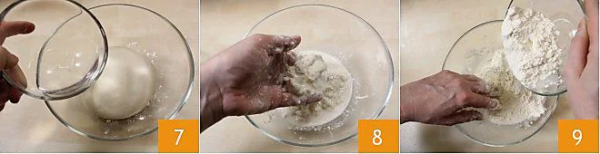 knead until you obtain a smooth and homogeneous dough, which you will shape into a ball 4. Let this first dough rise for at least 3 hours in the bowl, lightly floured, covered with plastic wrap, in the turned-off oven with the light on. The initial volume should double after the time has passed 6.