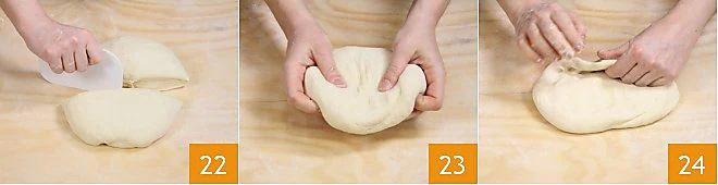 At this point, if you want to get two loaves, divide the dough into two equal parts, with which you can form two loaves or two baguettes 22. If you prefer, you can also make a single loaf. Now proceed this way for the loaves: lightly knead a piece, gathering the sides towards the center, flatten it slightly 23, then roll the dough onto itself, starting from one side 34, pressing with your fingers downwards and rolling it to the end. If you want a loaf, fold the two ends of the baguette underneath and round the dough.
