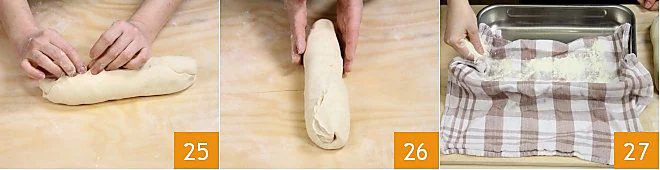 Pinch the top edge of the loaf with your fingers to adhere the dough 25. The first loaf is ready 26, proceed in the same way with the second piece of dough. Now take a baking tray and line it with two clean cloths, placed next to each other and well folded to create a divider in the center, well floured with semolina 27.
